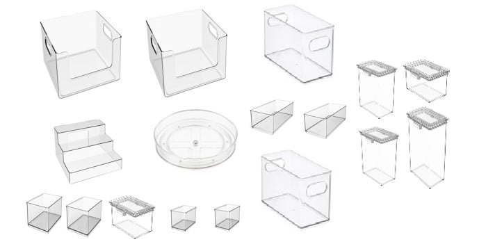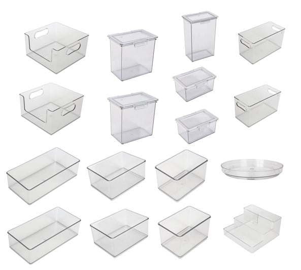 As seen on Netflix! Mix and match pieces to build custom systems Keep contents visible with clear design Tackles clutter in any space Set includes: 2 small canisters, 2 medium canisters, 1 large canister, 1 3-tier riser, 2 narrow bins, 2 small insert bins, 2 medium insert bins, 2 large insert bins, 2 open front bins, and 1 low wall turntable