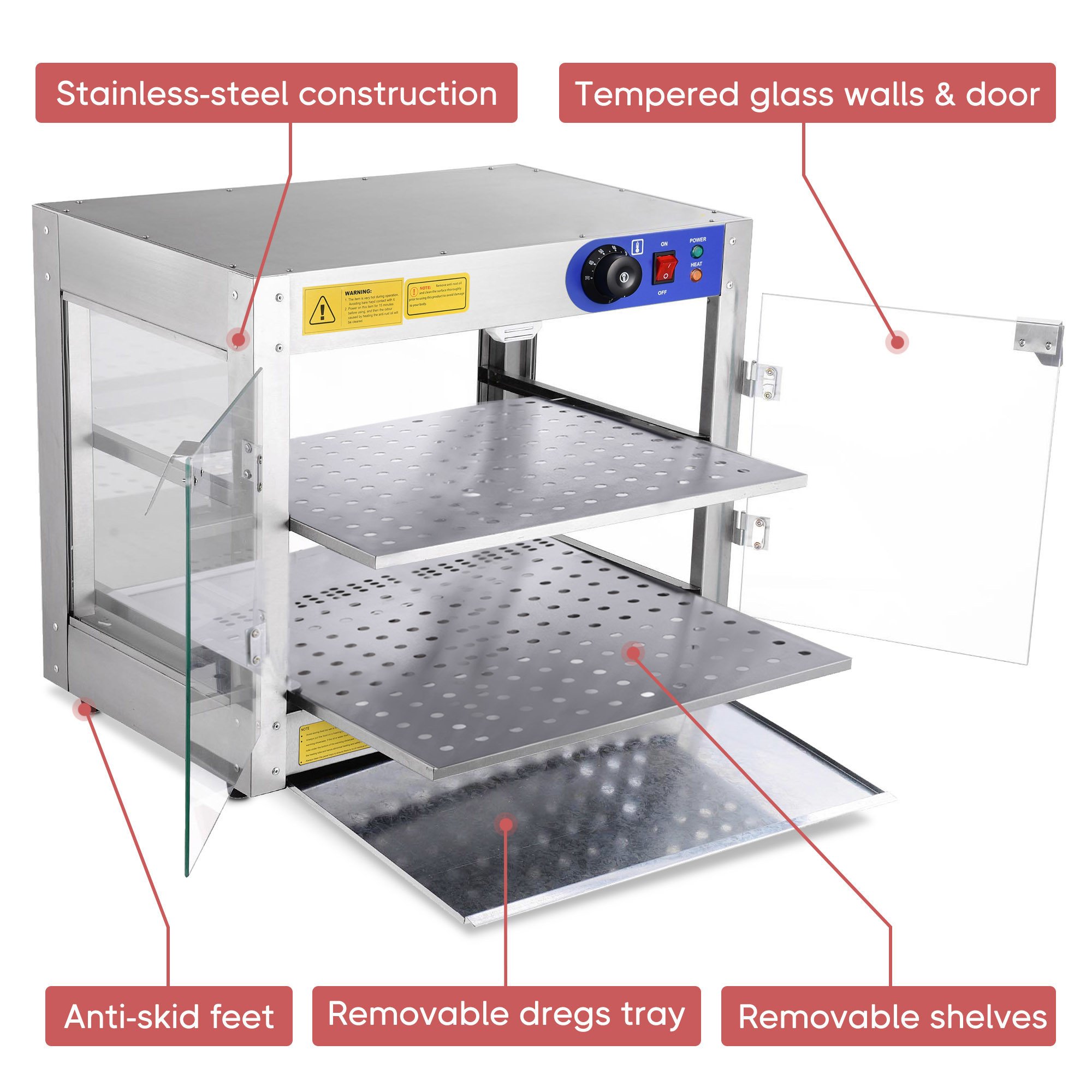 - Durable & Easy to Maintain - Features sturdy stainless-steel construction with tough tempered glass walls and doors for long lifespan and clear vision of the food inside; anti-skid feet at the bottom for stability; heat emission holes on the top and removable bottom tray with holes for better heat dissipation; tray is designed for easy collecting oil and dreg-Safe Design & Wide Applications - Buzzer on the warmer for overheating protection; it will buzz and flicker red light for high-temperature warning; Suitable for commercial use in canteens; bakeries; cafes; buffets and fast food restaurants; ideal for warming pizza; egg tart; fried chicken; hamburger; etc