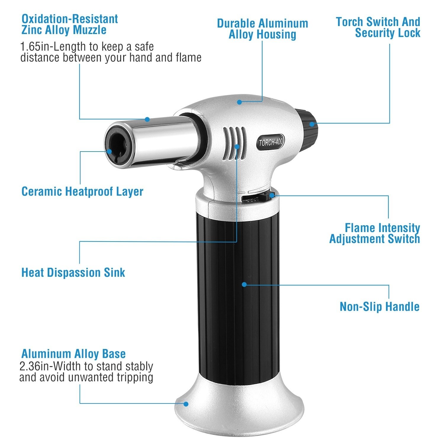 **STURDY AND DURABLE*:Integrating with premium aluminum alloy housing; non-slip handle; oxidation-resistant zinc alloy muzzle and ceramic heatproof layer; our butane torch is sturdy; durable; lightweight and long lifespan.