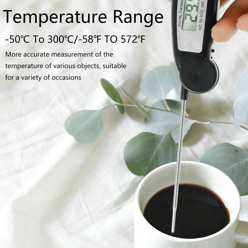 KT Deals Digital Meat Thermometer with large LCD display and long foldable stainless-steel probe is a right-hand assistant for your good cooking especially for grilling and barbecue. Can be read out instantly and accurately after 3-4 seconds response when you insert the thermometer into the food. Press the Hold button to keep the temperature on display if needed. The button battery is included and it will shut down automatically after 10 minute inactivity to preserve battery life.