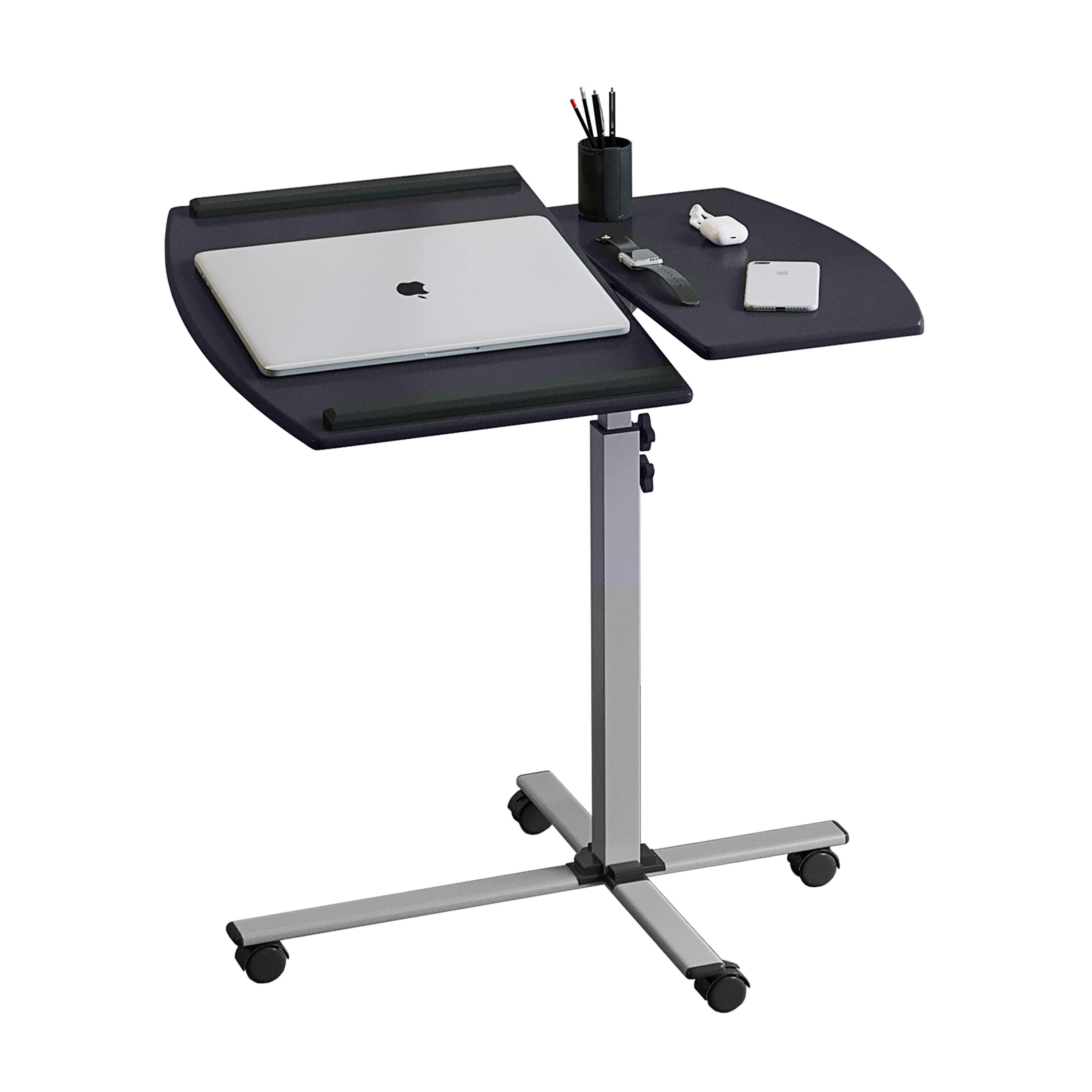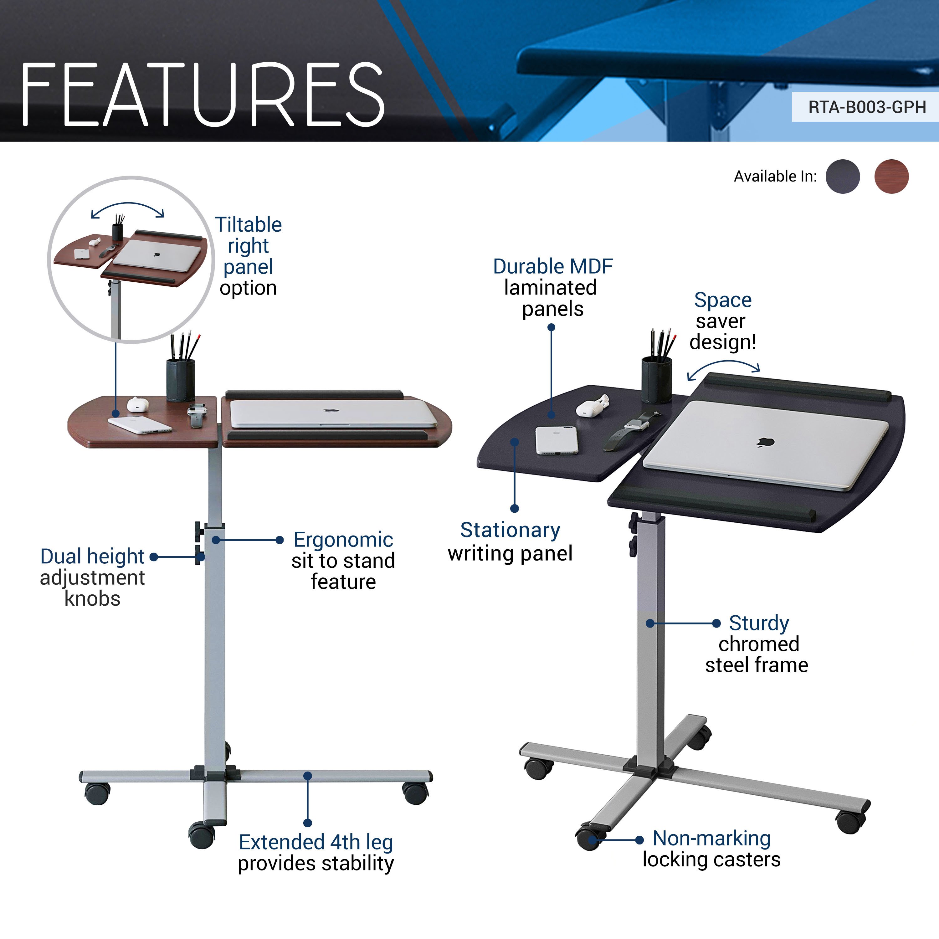 Techni Mobili Rolling Adjustable Laptop Cart, GraphiteThe Techni Mobili Deluxe Rolling Laptop Stand saves space while providing the laptop or writing setup you need .The main panel tilts so you can adjust it to the most ergonomic, comfortable working angle. It also features safety edge-stoppers to prevent objects from sliding off when the panel is tilted. You can also easily adjust the height from 29.5" to 34.25" with a dual knob system. The extended 4th leg provides increased stability. Two of the fours non-marking nylon casters include locking mechanisms. The main tilting table panel has a 30lbs weight capacity, the stationary table panel has a 45lbs weight capacity and both are made of MDF with a moisture laminate veneer atop scratch-resistant powder-coated steel frame. Color: Graphite.
