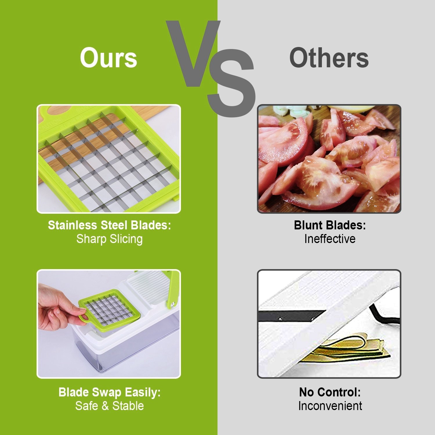 *3 IN 1 MULTIFUNCTION BLADES*:Come with 3 interchangeable dicer blades; which make it much easier to get different size food dices in even shape as you need. It's an amazing kitchen helper to cut prep time in half. Save time and energy!