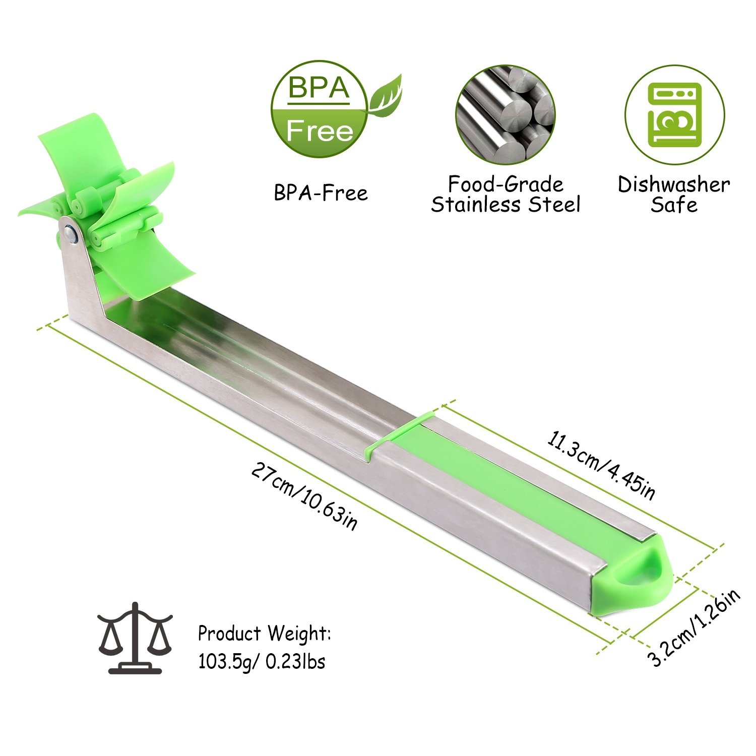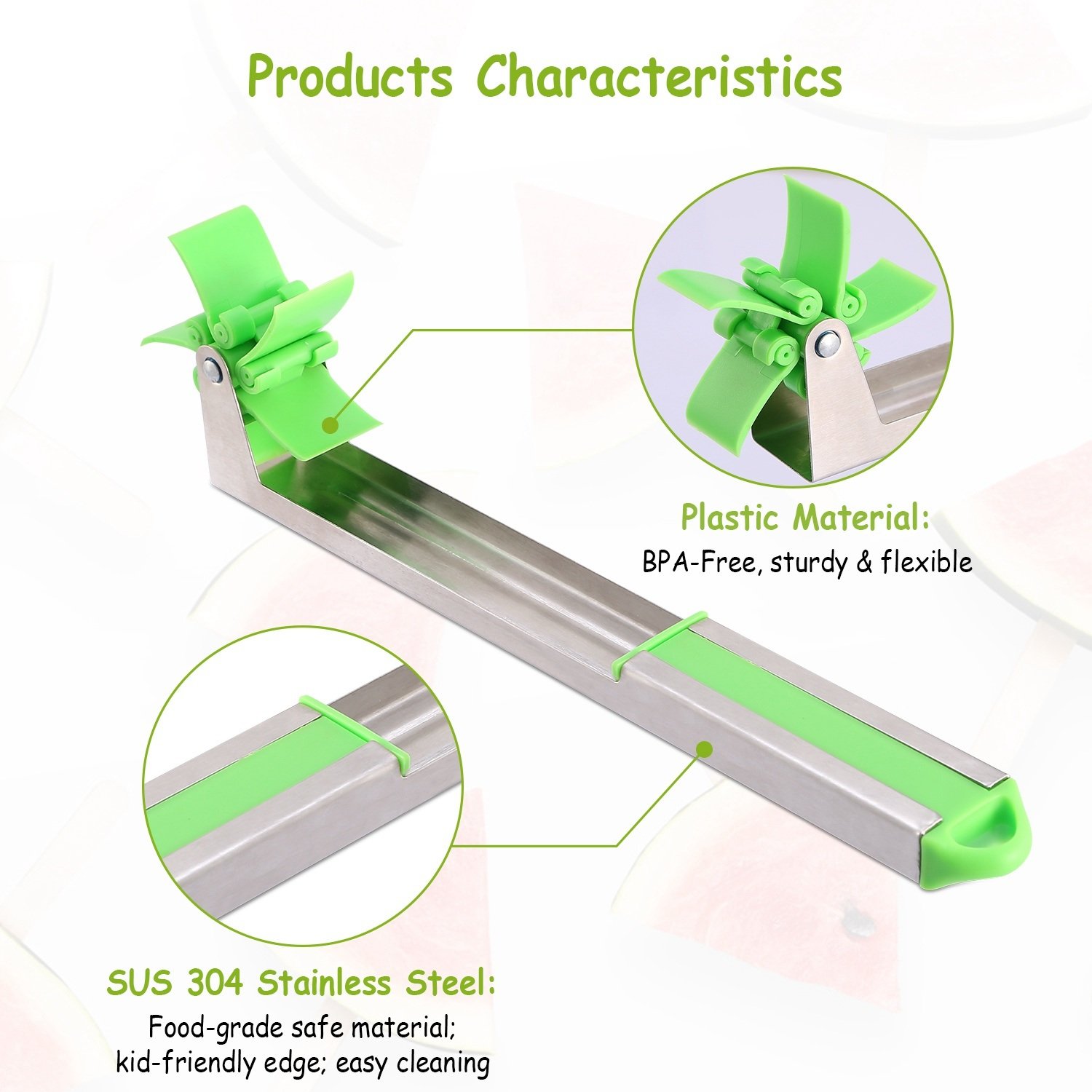 **SAFE & HIGH-QUALITY MATERIAL*:Our watermelon slicer is made of Safe Material and 100% food-grade stainless steel and plastic. It's BPA free; NO Smell; NO Toxic; and our watermelon slicer could repeated recycling; easy to clean and no stains.